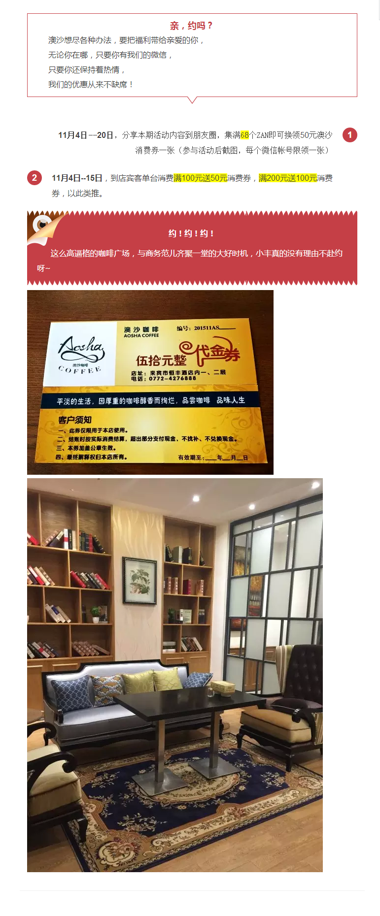 澳沙咖啡廣場開業(yè)大吉,集ZAN送券,滿100送50,優(yōu)惠根本停不下來!