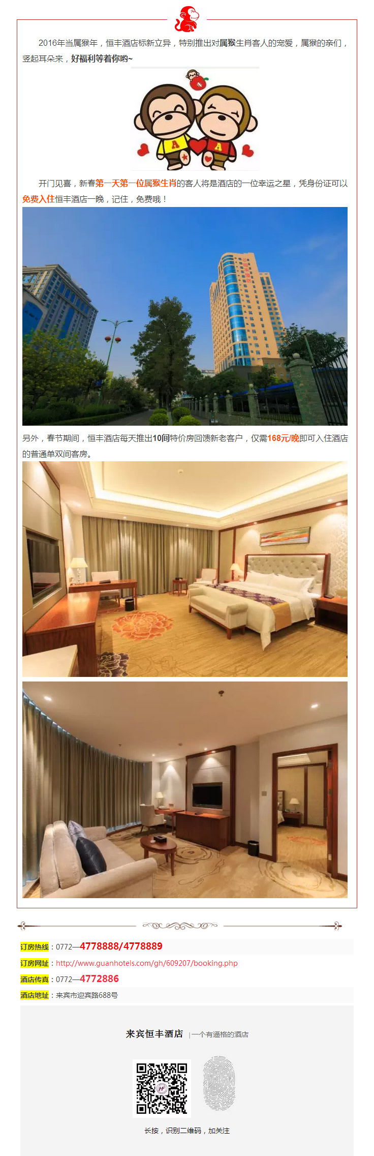 新春開門見喜:新春第一天第一位屬猴的客人入住酒店,全免!